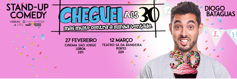 "Cheguei aos 30, mas muito contra a minha vontade", é o primeiro espectáculo a solo de stand-up comedy de Diogo Batáguas. Sobe ao palco do Cinema São Jorge no dia 27 de fevereiro e no Teatro Sá da Bandeira no dia 12 de março pelas 22.
