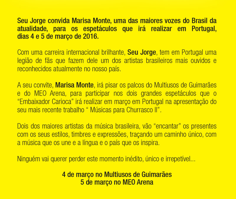 Seu Jorge convida Marisa Monte | Multiusos de Guimarães e Meo Arena - 4 e 5 de Março